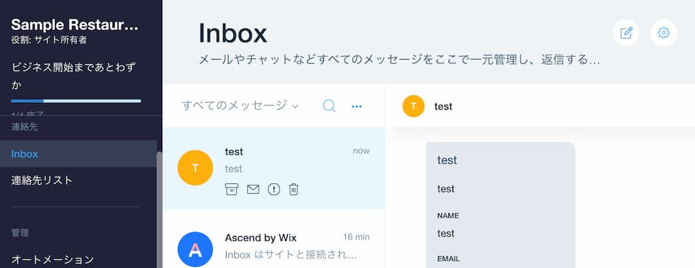 ホームページのお問い合わせタブからの問い合わせは、管理画面のinboxに内容が入ってきます。