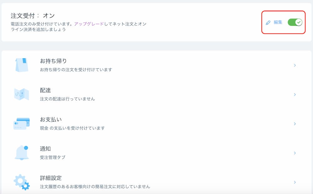 ネット注文を受け付ける場合は、注文をオンにする必要があります。