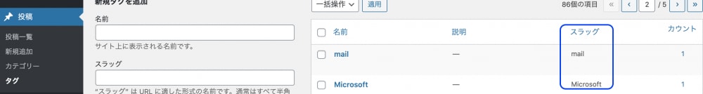 原因としては、この画面から追加した日本語のタグが、スラグも日本語になってしまうためでした。