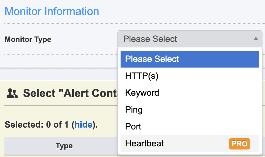 HTTP(s)、Keyword、Ping、Port。有料版だと、Headbeatも可能です。