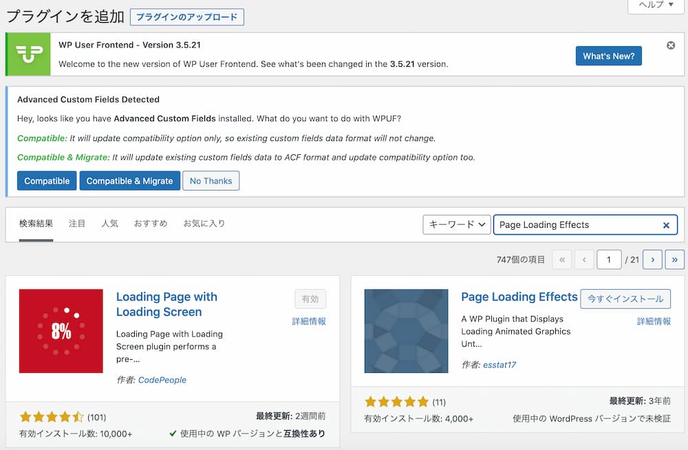 プラグインの新規追加から、「Page Loading Effects」を検索して設定します。
